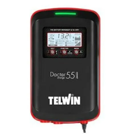 Telwin Doctor Charge 55 Connect- 807614Chargeur de batterie électronique multifonction (BATTERY MANAGER) pour l’entretien complet des batteries WET, GEL, AGM, MF, PbCa, EFB, Li à 6V/12V/24V et pour les activités de support, y compris le diagnostic, sur les véhicules dans les ateliers, les carrosseries et les concessions. Spécifications Tension secteur 230V Fréquence secteur 50/60HzConsommation de puissance de charge 610WTension de charge 6/12/24V Courant de charge effectif 45/45/23 AC Courant de charge 40/40/20 AC Courant de charge 1V/C EN60335-2-29 40 (Boost) ACCapacité nominale minimale réf. 10AhCapacité nominale maximale réf. 600AhIndice de protection IP33Dimensions 9.2x20x33 cm – Charge et entretien automatiques dans Pulse Tronic en fonction de la technologie de batterie sélectionnée;- Fonction BOOST pour une charge rapide de la batterie ; – Fonction COLD pour charger et maintenir les batteries à basse température ; – ALIMENTATION STABLE pour les activités de diagnostic (BSU), pendant les changements de batterie (SUPPLY) et pour maintenir des batteries saines dans les véhicules en salle d’exposition ; – ENTRETIEN DES BATTERIES avec fonction RECOVERY pour la récupération des batteries sulfatées ou fortement déchargées et fonction EQUALISATION pour le rétablissement d’une fonctionnalité optimale avec régénération périodique ; – TESTER pour vérifier la tension aux bornes, la capacité de démarrage (CCA) et le fonctionnement de l’alternateur du véhicule ; – Aide au démarrage;- Fonction de compensation de l’allongement du câble ; Écran LCD;- Protection contre les surcharges, les courts-circuits et les inversions de polarité. Met en œuvre le PFC. Complet avec câbles et pincesvoltage: 6/12/24V